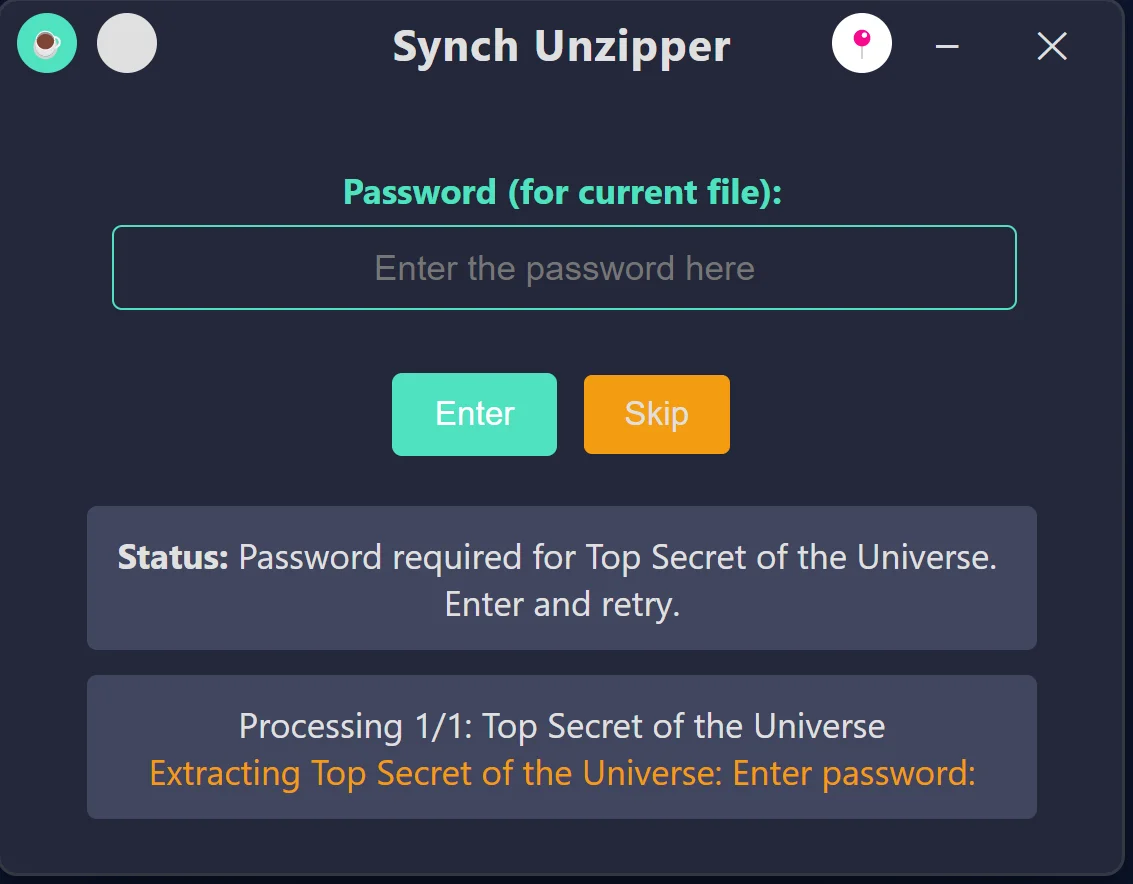 A: Yes,👌 they’re supported. If the archive is password-protected, you’ll be prompted to enter it. Of course, if you don’t know the password, the archive cannot be extracted… (However things might be different if I ever make a Pro version!🤫)