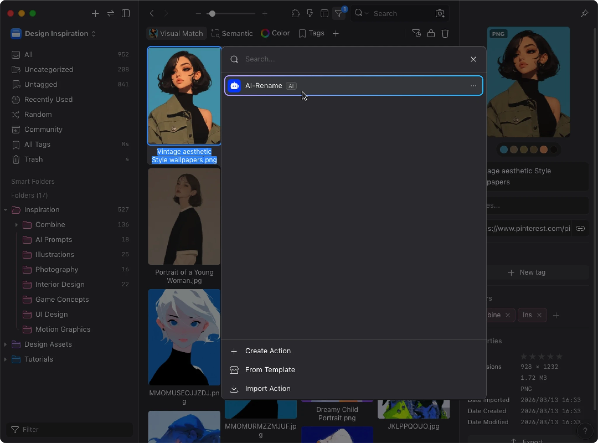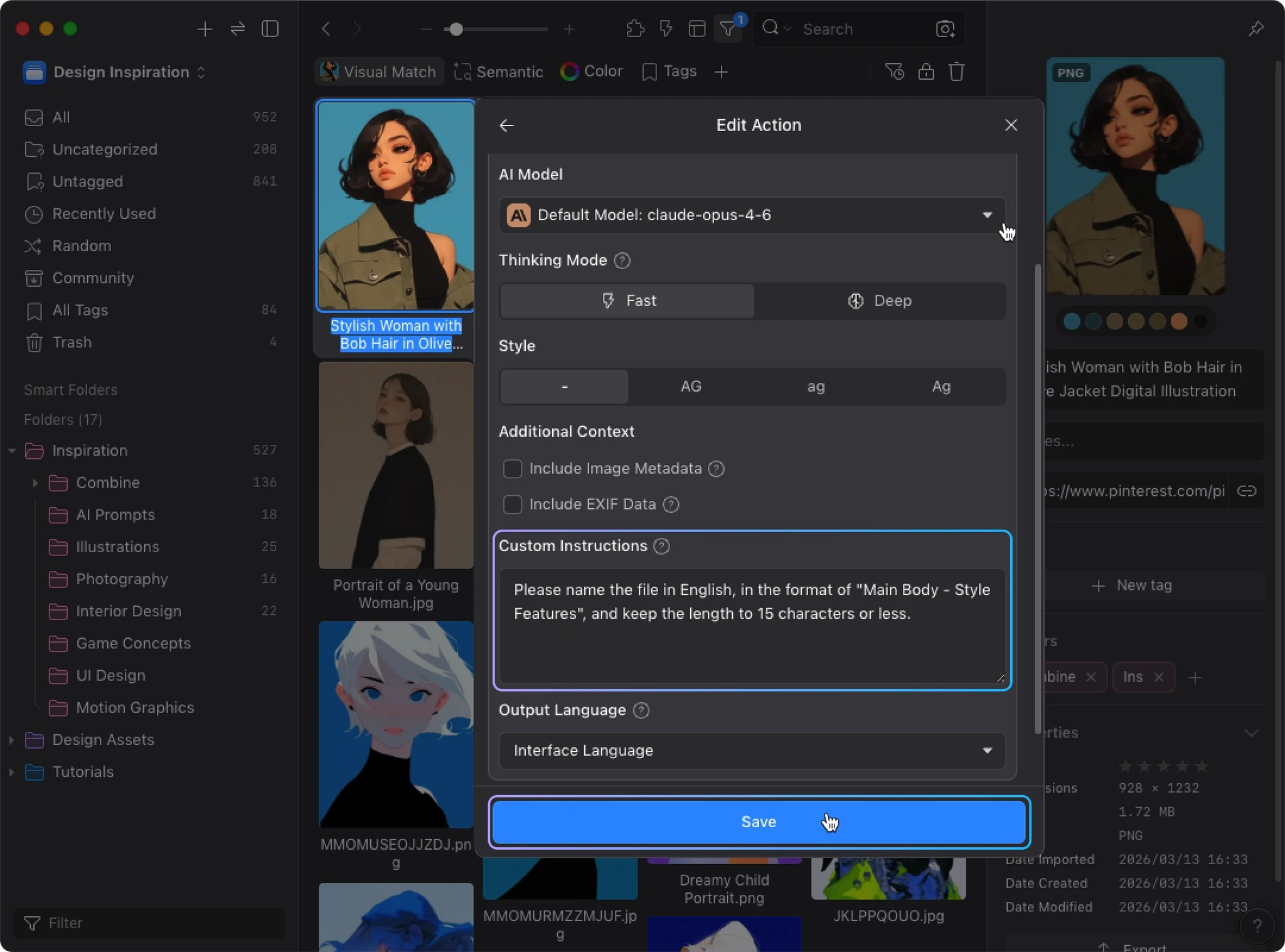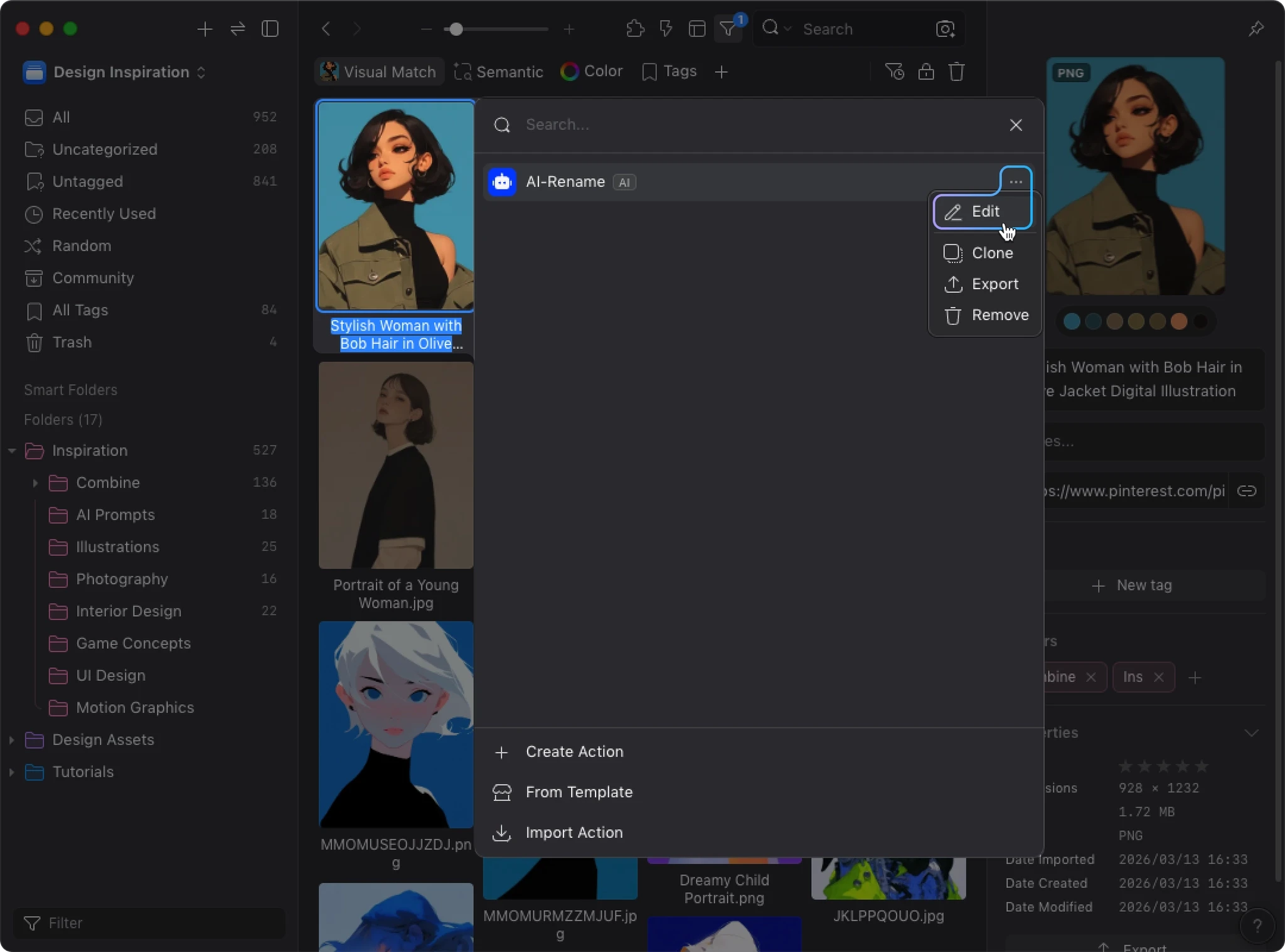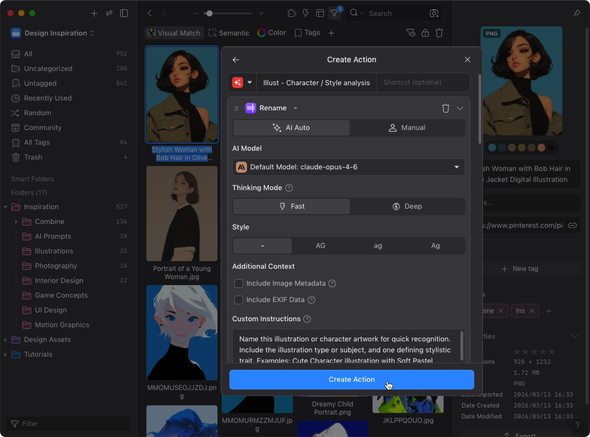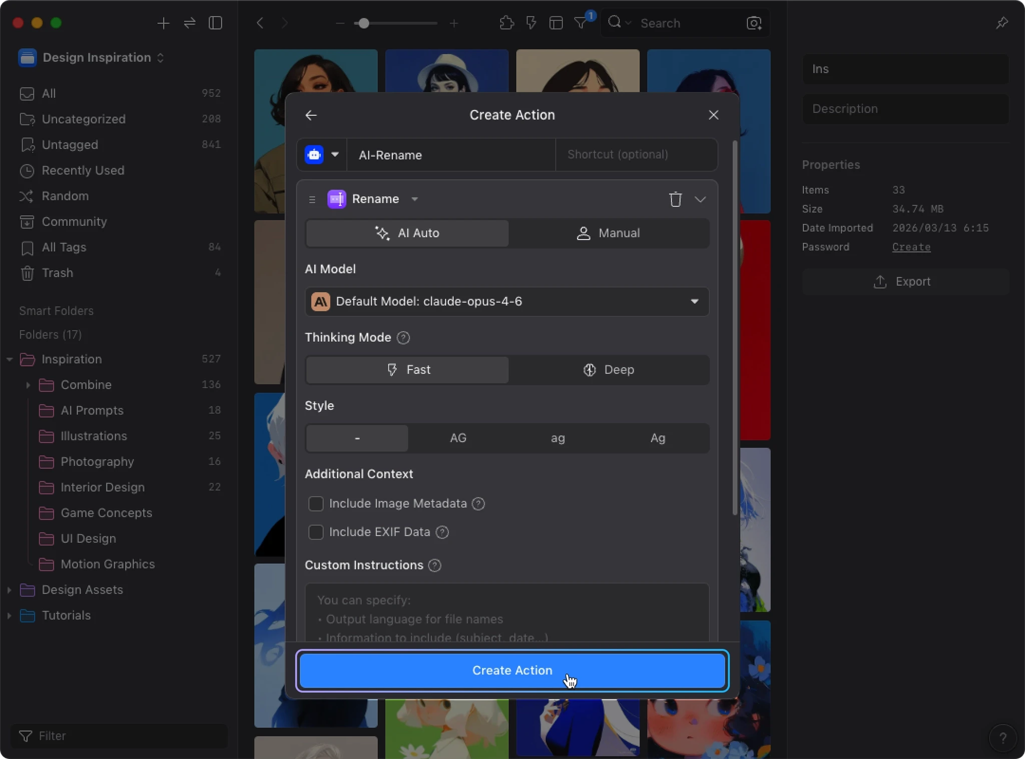 AI Search builds a visual similarity index for your library. When AI Action detects this data, it uses visual similarity and your existing organization to improve tagging and sorting accuracy. Instead of analyzing each image in isolation, AI can reference how you’ve already organized similar images.